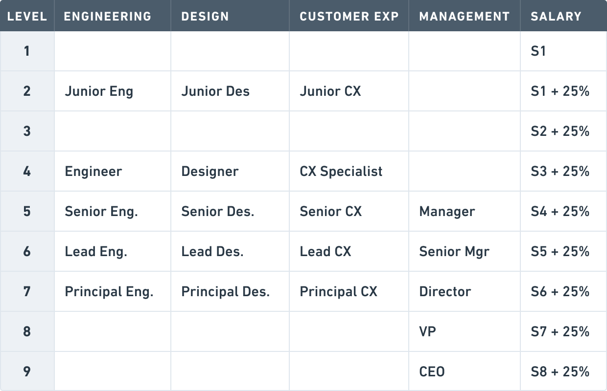 To start with, we have 9 distinct levels, each associated with a specific salary and mapped to every role we have at the moment. Increases between each level are the same—exactly 25%. This is what it looks like: