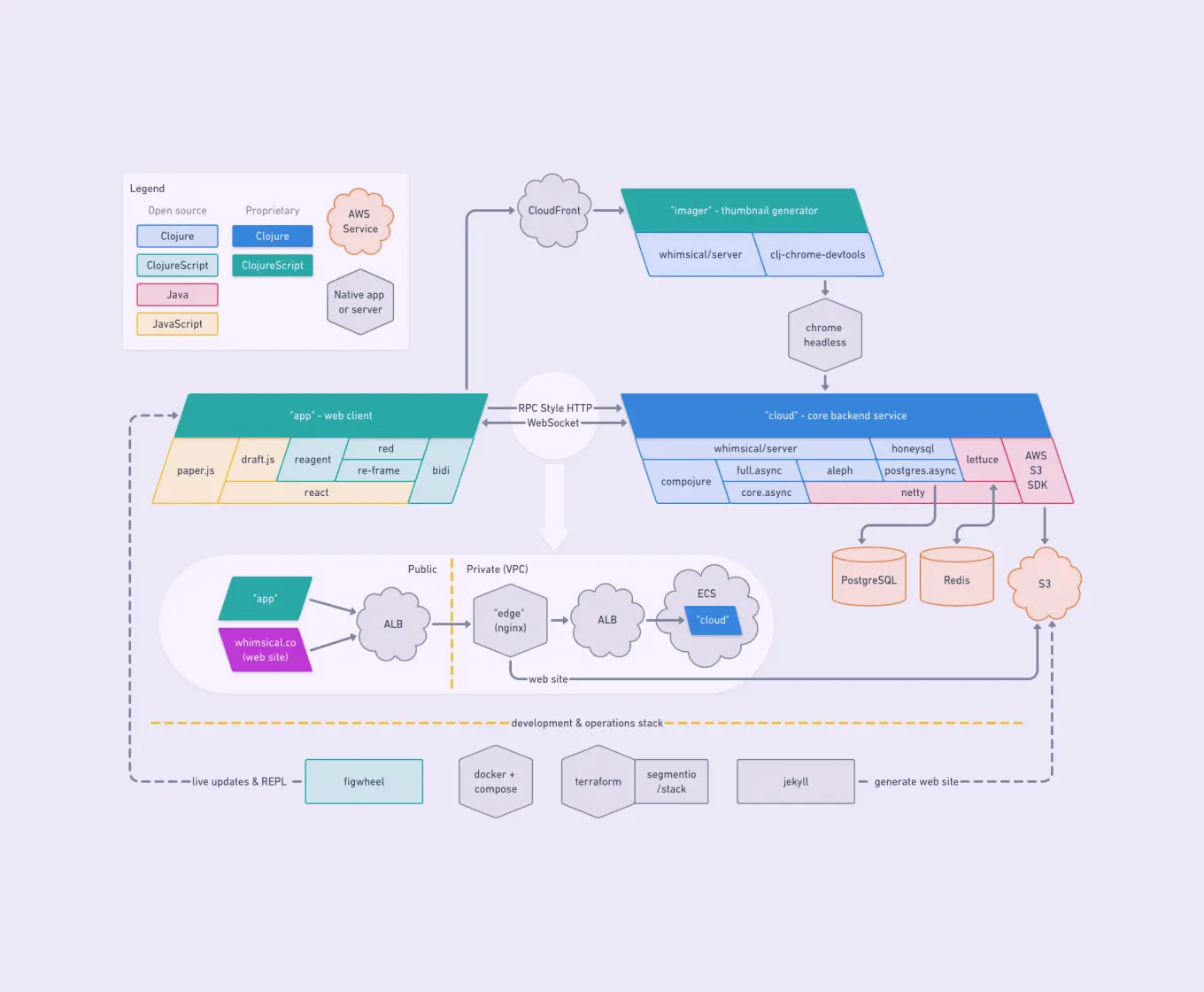 For Whimsical, we chose Clojure and its sibling ClojureScript. I discovered Clojure a few years ago as a saner alternative to Java for building backend services running on JVM. Later on, we successfully moved a fairly sizable front-end app, as well as parts of native mobile apps, to ClojureScript.