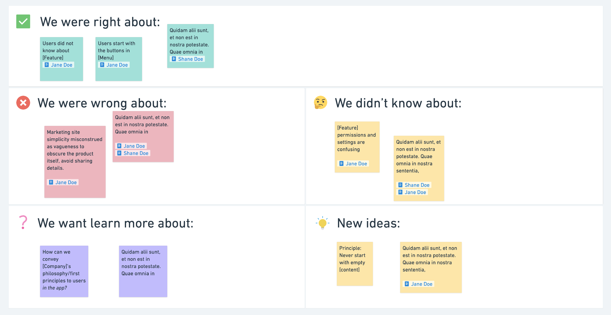 Highlights from our conversations, survey answers, and secondary research (competitor analysis, etc.) are summarized individually and presented on one board. We use a delta/next board with color-coded sticky notes to easily scan and process any recurring themes and trends in the information we’ve gathered.