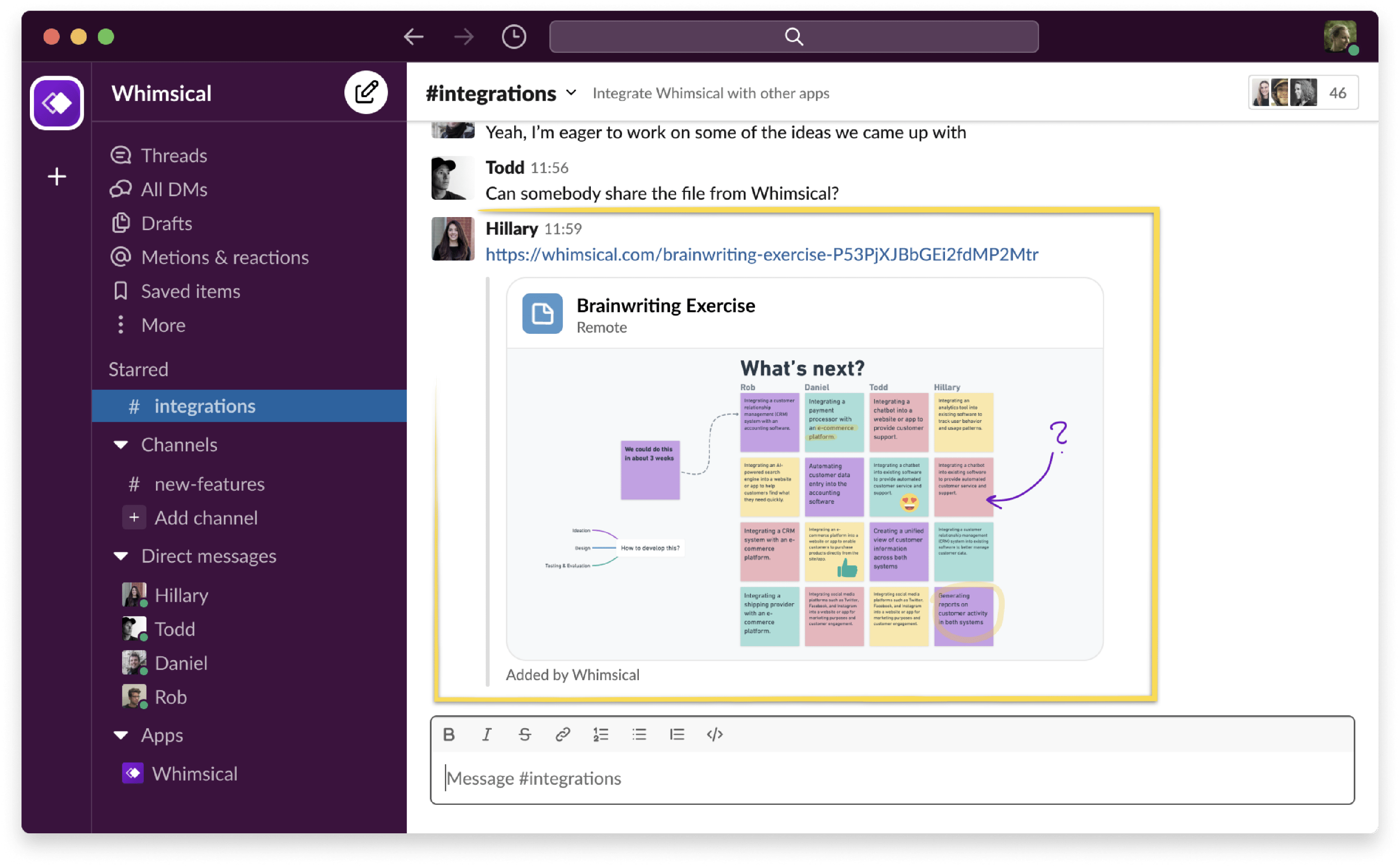 Make every Whimsical link worth sharing. When you drop a Whimsical board into Slack, it unfurls as a rich image preview so your teammates can see what's inside.