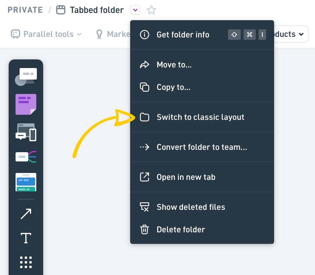 You can switch between classic and tabbed layout for your folders at any time, just click on the folder actions menu and choose Switch to tabbed layout or Switch to classic layout: