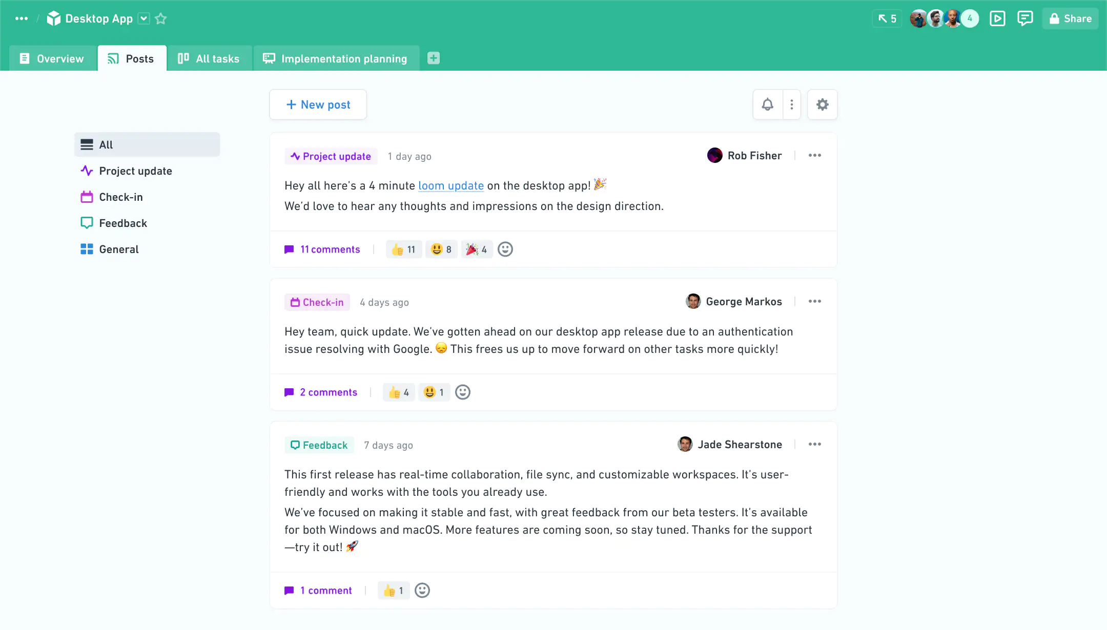 Posts bring important updates and discussions into focus—where the real work happens, not lost in the chaos of chat apps.
